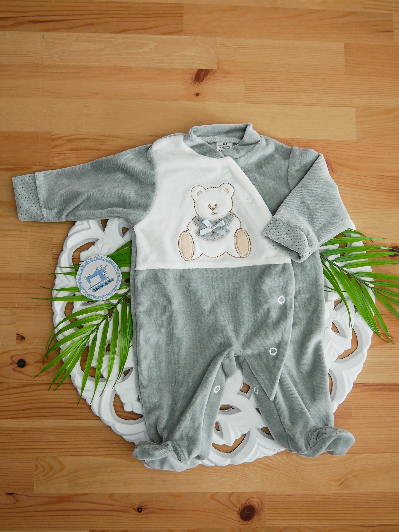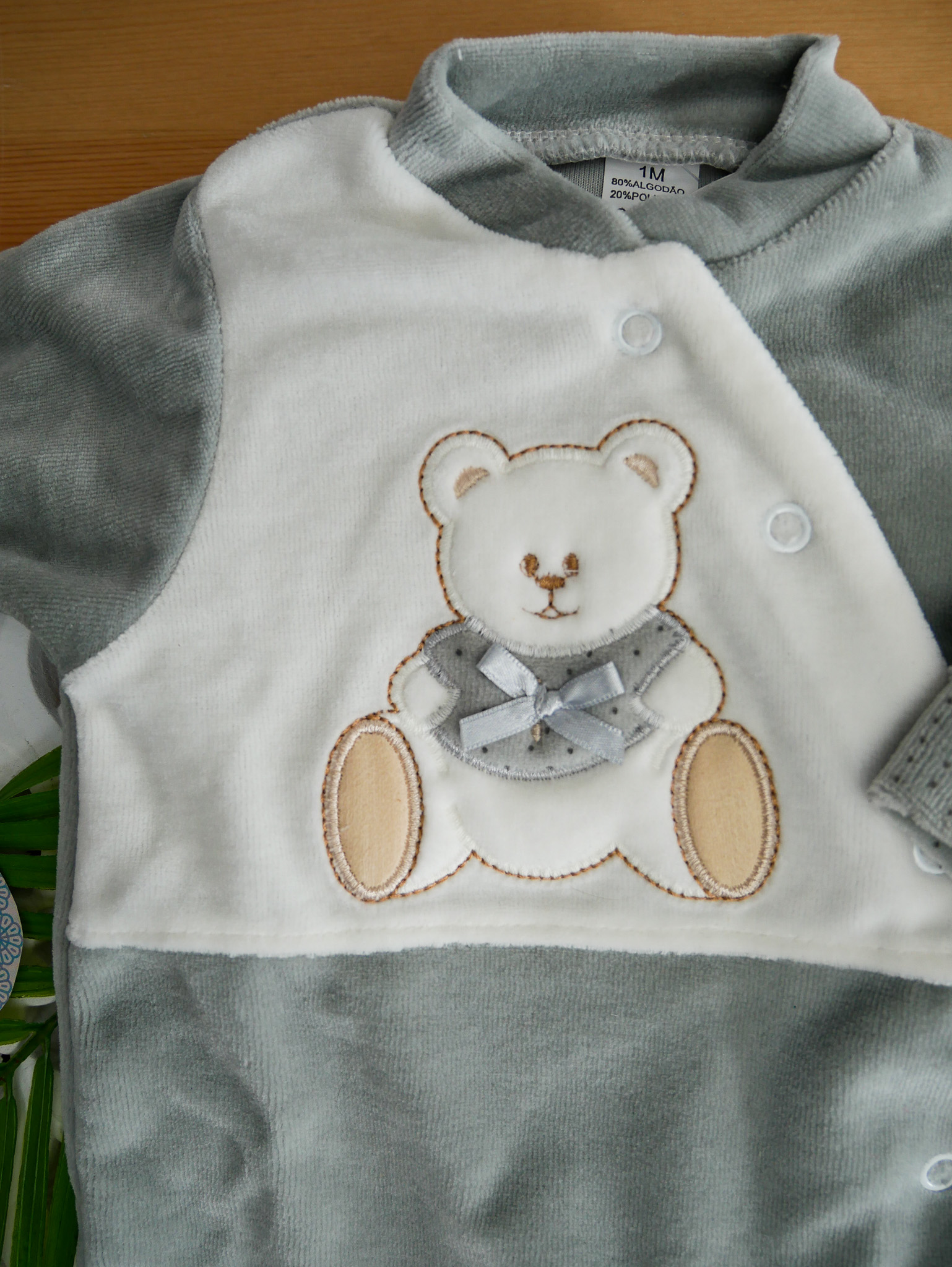 Babygrow em veludo suave com ursinho com laços bordado.
