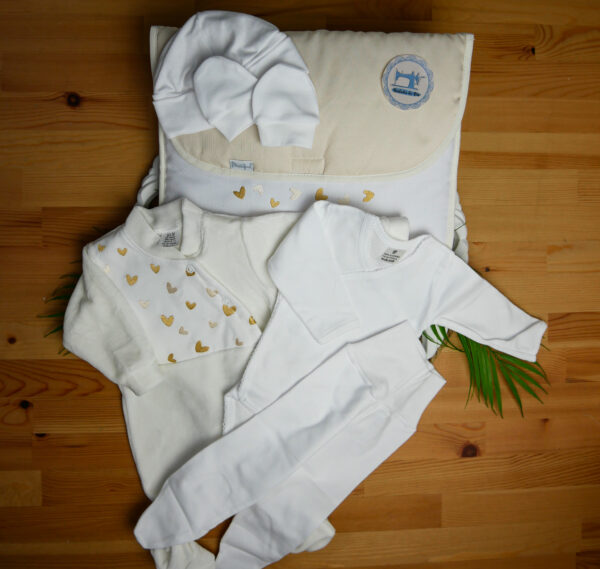 Este conjunto inclui todos os itens essenciais para os primeiros dias do seu bebé: bolsa de 1ª roupa, babygrow, body, calças interiores, luvas e gorro. Perfeito para garantir que o seu bebé tenha tudo o que precisa para estar aconchegado e elegante.