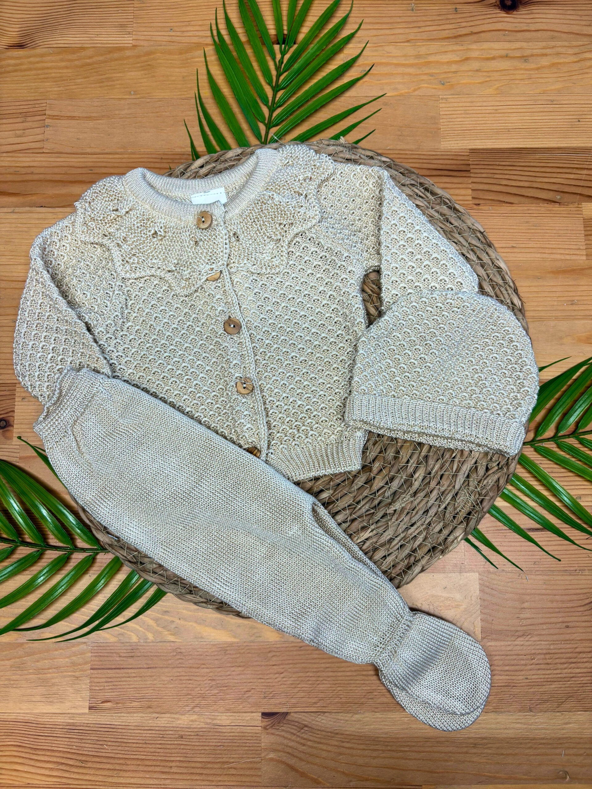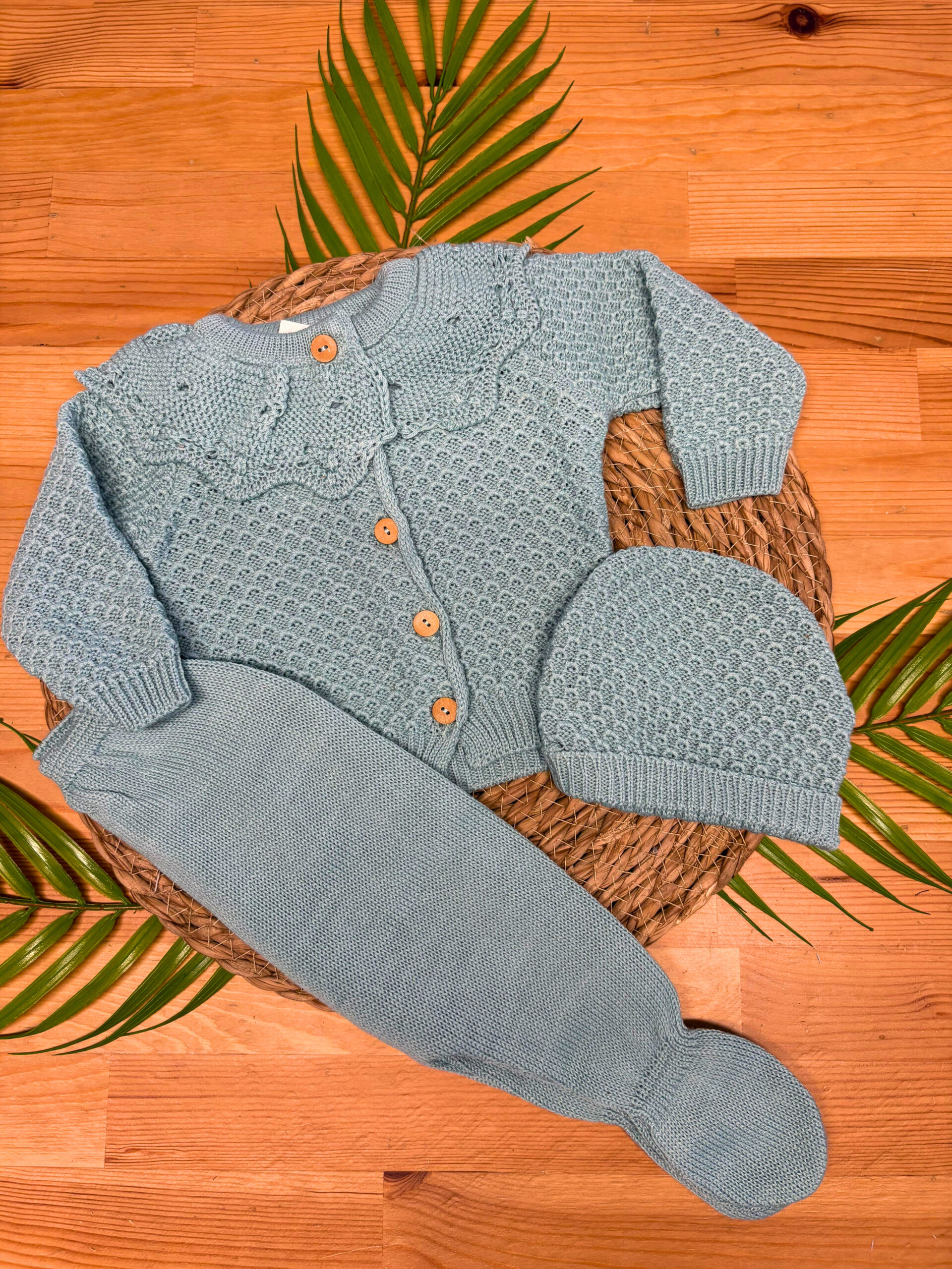 Este conjunto de malha para bebé inclui três peças essenciais: camisola, calça e gorro, que funcionam perfeitamente em conjunto ou separadamente. Além disso, cada peça foi confecionada com materiais de alta qualidade, ideais para a pele sensível do bebé.