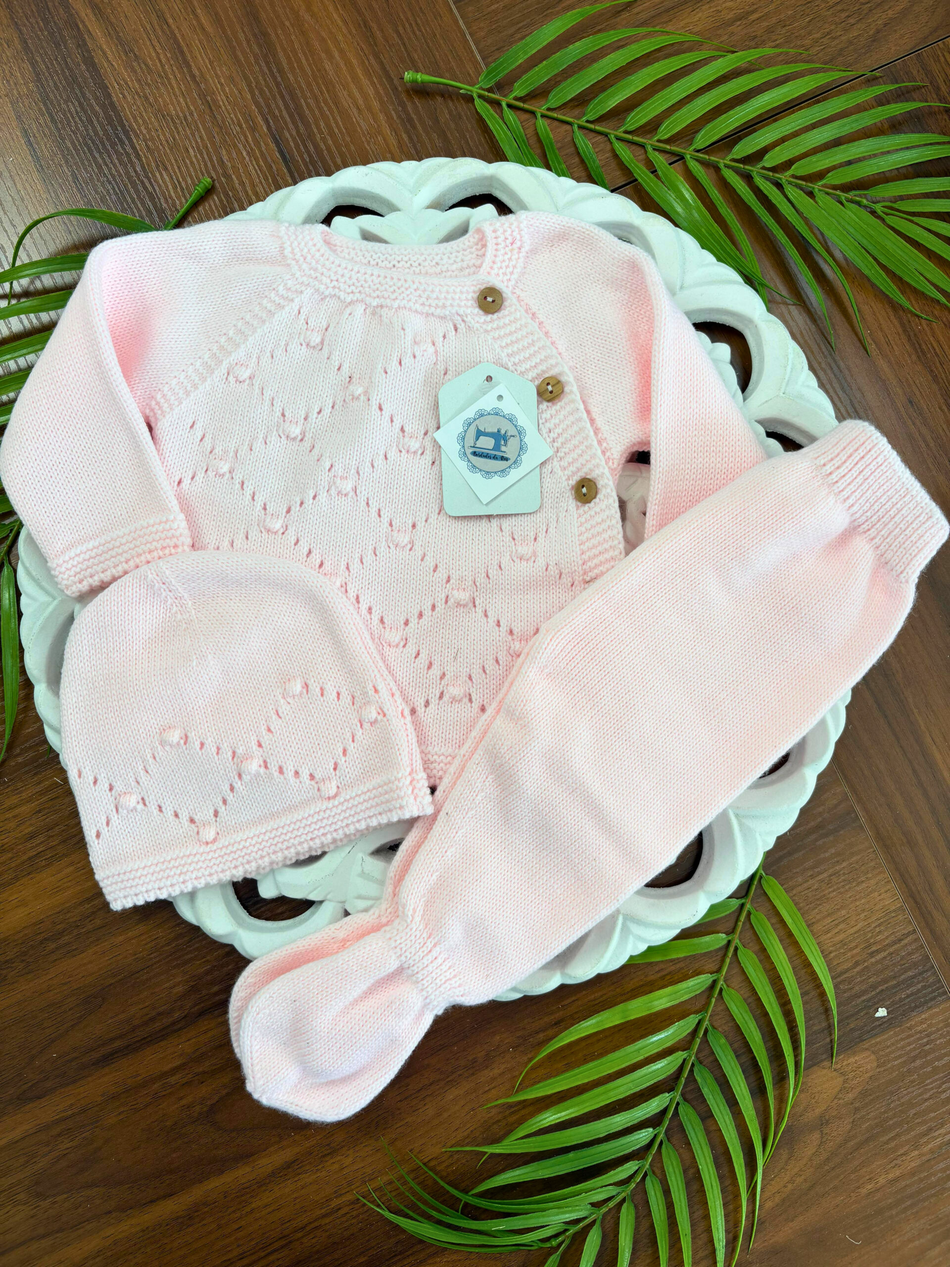 Garanta já o Conjunto de 3 Peças em Malha Pipoca – Camisola, Calça e Gorro e ofereça ao seu bebé conforto, proteção e um estilo intemporal em qualquer ocasião.