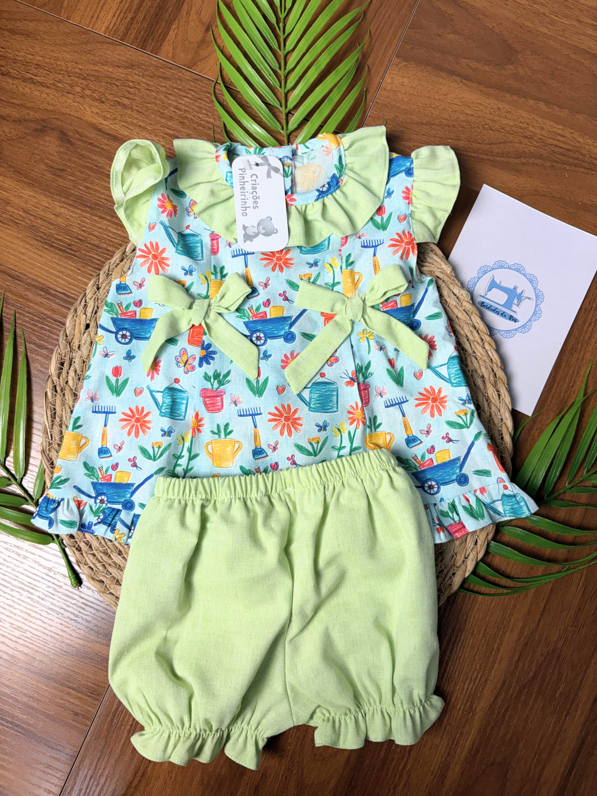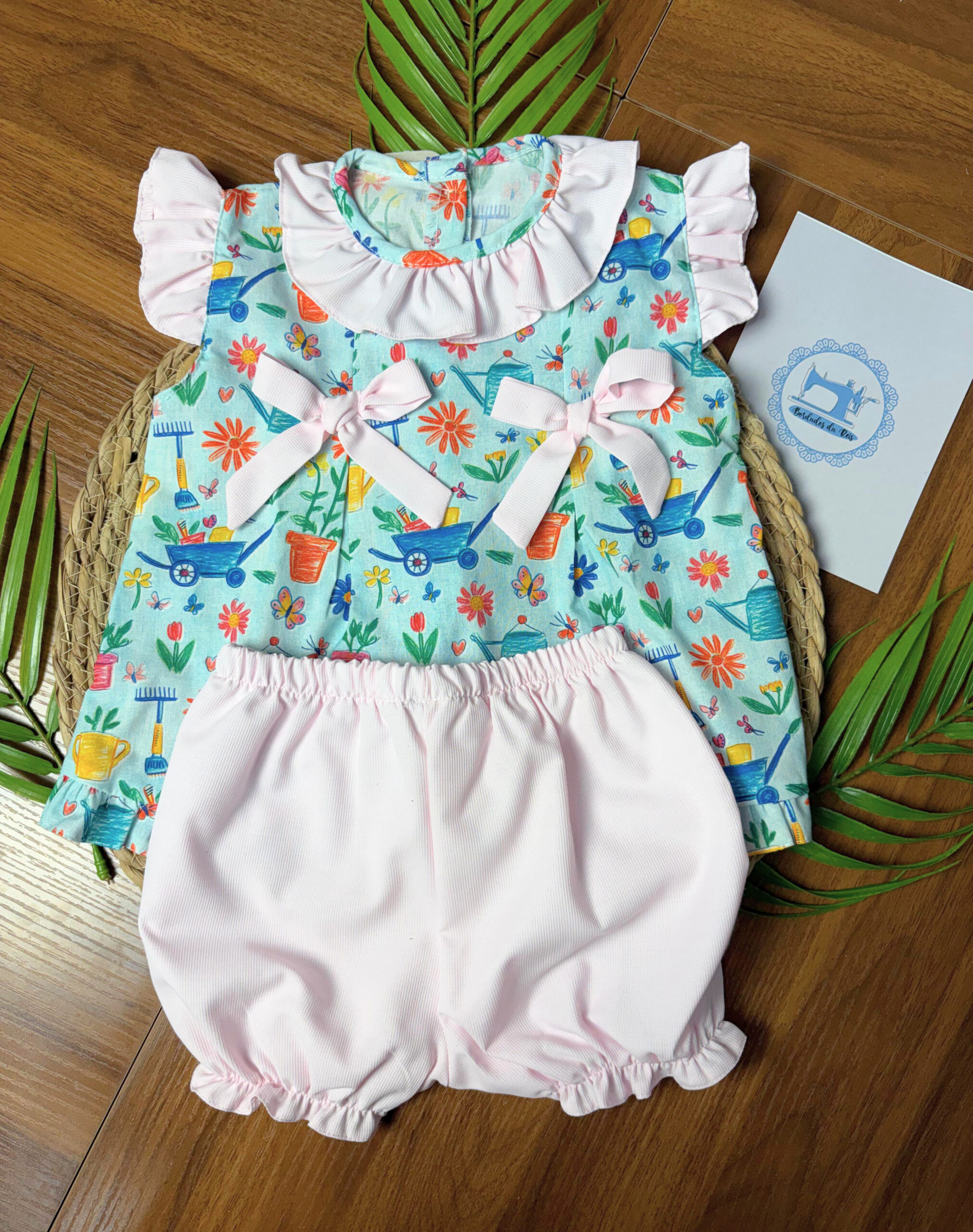 Por outro lado, o design do conjunto de blusa e cueiro Jardinagem aposta numa estética simples e encantadora. Assim, permite combinações fáceis com meias, gorros ou casaquinhos, criando looks harmoniosos e cheios de ternura. Além disso, o padrão às bolinhas acrescenta um detalhe visual discreto, mas muito especial.