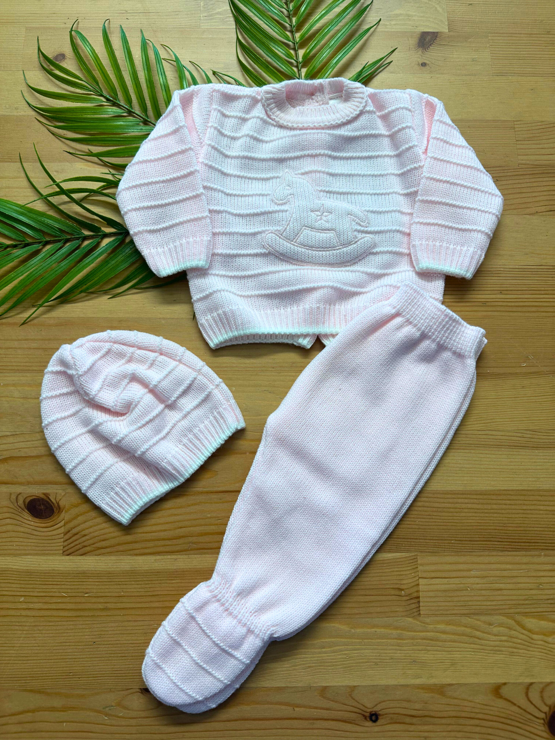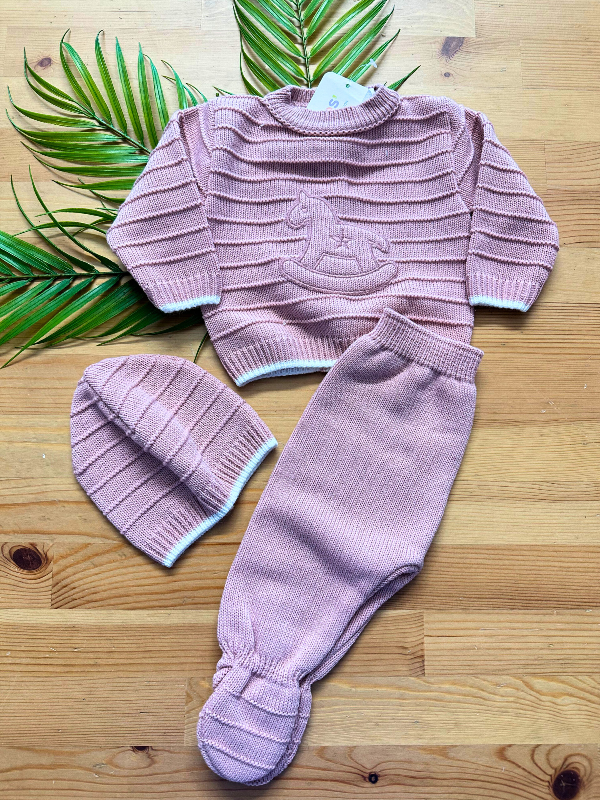 O conjunto de malha cavalinho com 3 peças é a escolha ideal para manter o seu bebé confortável, protegido e cheio de estilo. Feito com malha macia e delicada, este conjunto oferece o máximo de conforto, perfeito para dias mais frios. Com um design clássico e muito prático, inclui umas jardineiras aconchegantes, um casaco quentinho e uma touca adorável, criando um look completo e irresistível.