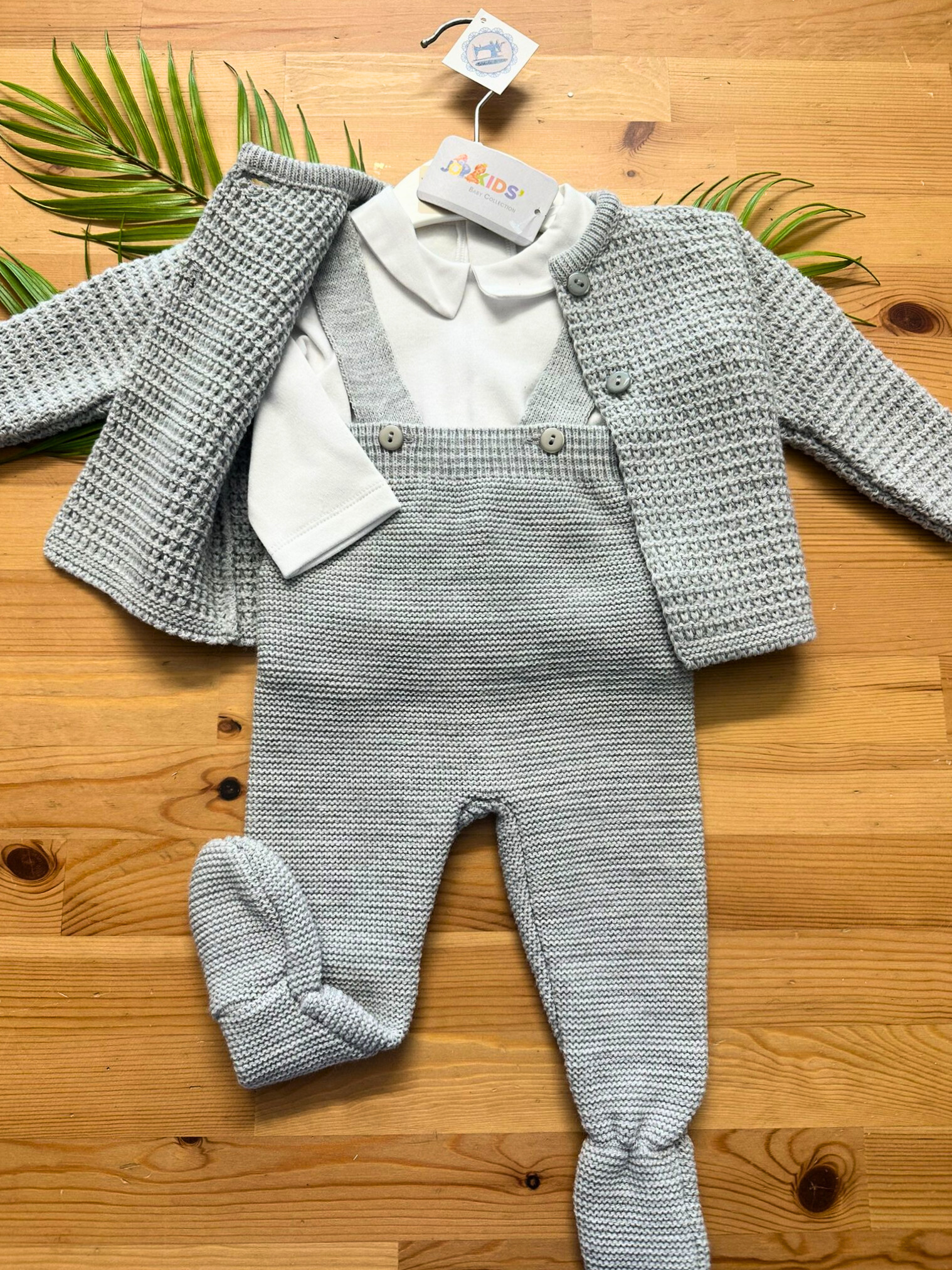 O conjunto de malha de menino com 3 peças é a escolha ideal para manter o seu bebé confortável, protegido e cheio de estilo. Feito com malha macia e delicada, este conjunto oferece o máximo de conforto, perfeito para dias mais frios. Com um design clássico e muito prático, inclui umas jardineiras aconchegantes, um casaco quentinho e um body, criando um look completo e irresistível.
