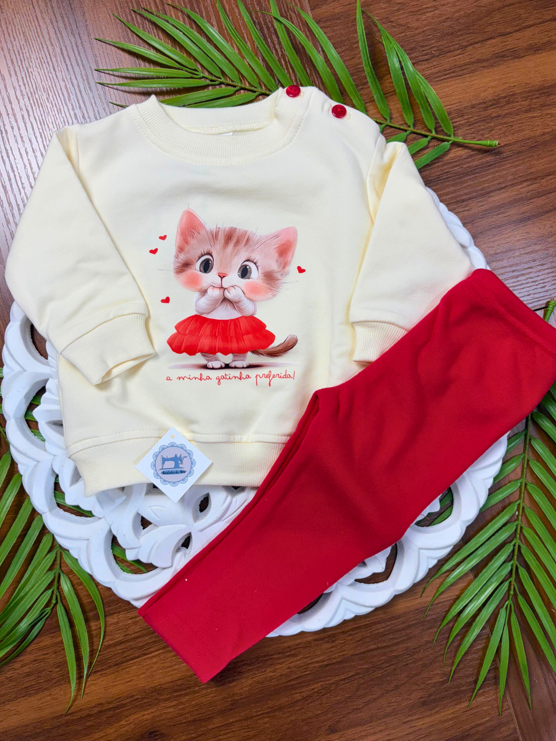 Este conjunto combina um estilo casual com um toque delicado, o que o torna perfeito para diversas ocasiões. Além disso, o padrão Gatinha acrescenta charme e personalidade ao visual.