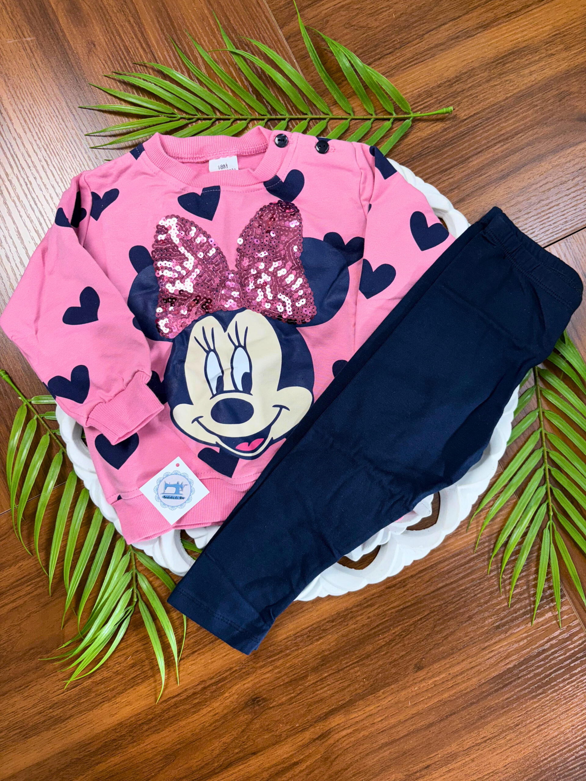 Este conjunto combina um estilo casual com um toque delicado, o que o torna perfeito para diversas ocasiões. Além disso, o padrão Minnie com Lantejoulas acrescenta charme e personalidade ao visual.