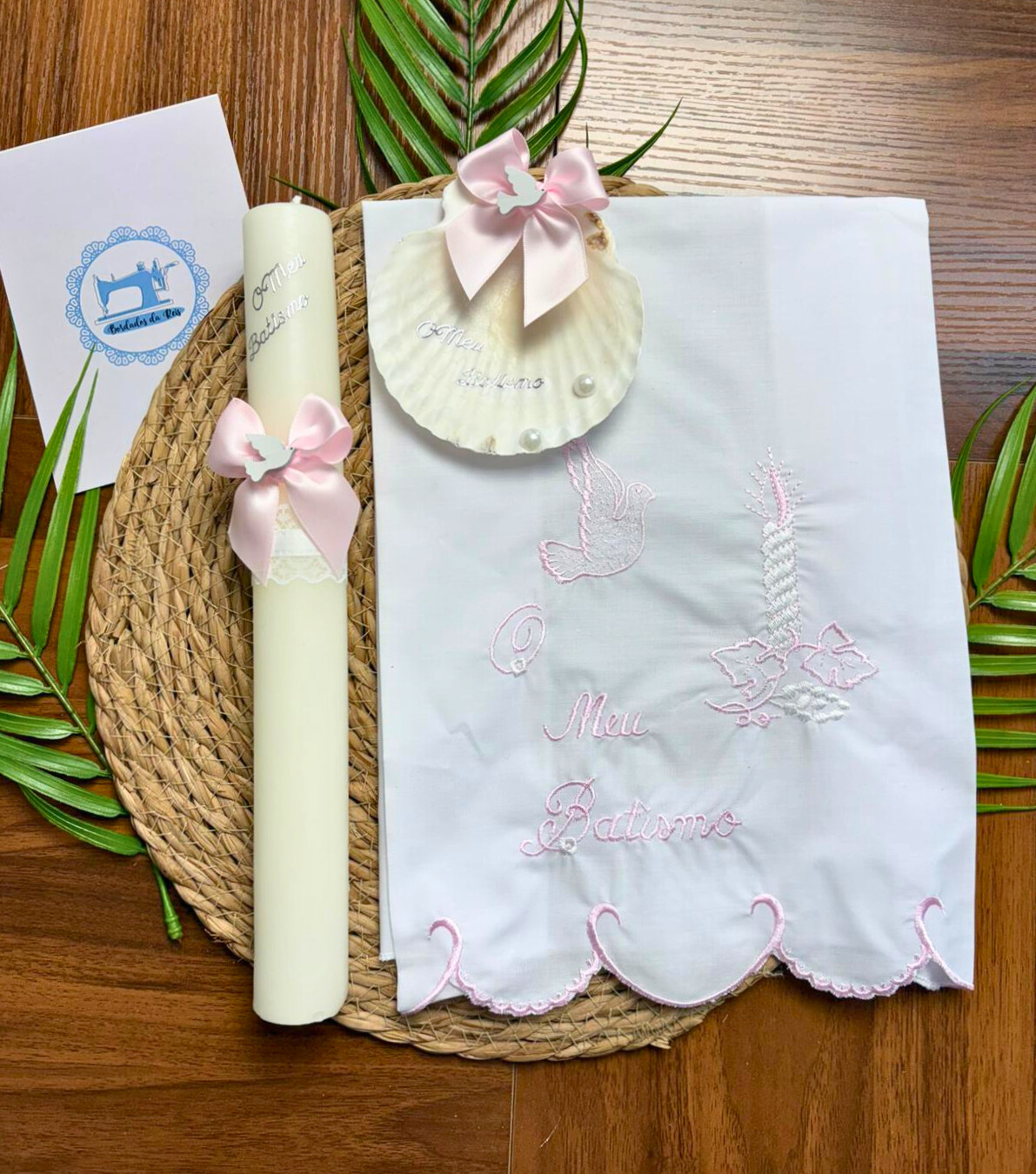 - Vela de Batismo: Um símbolo essencial, decorado com detalhes elegantes e tradicionais. Representa a luz e a proteção no caminho do bebé.