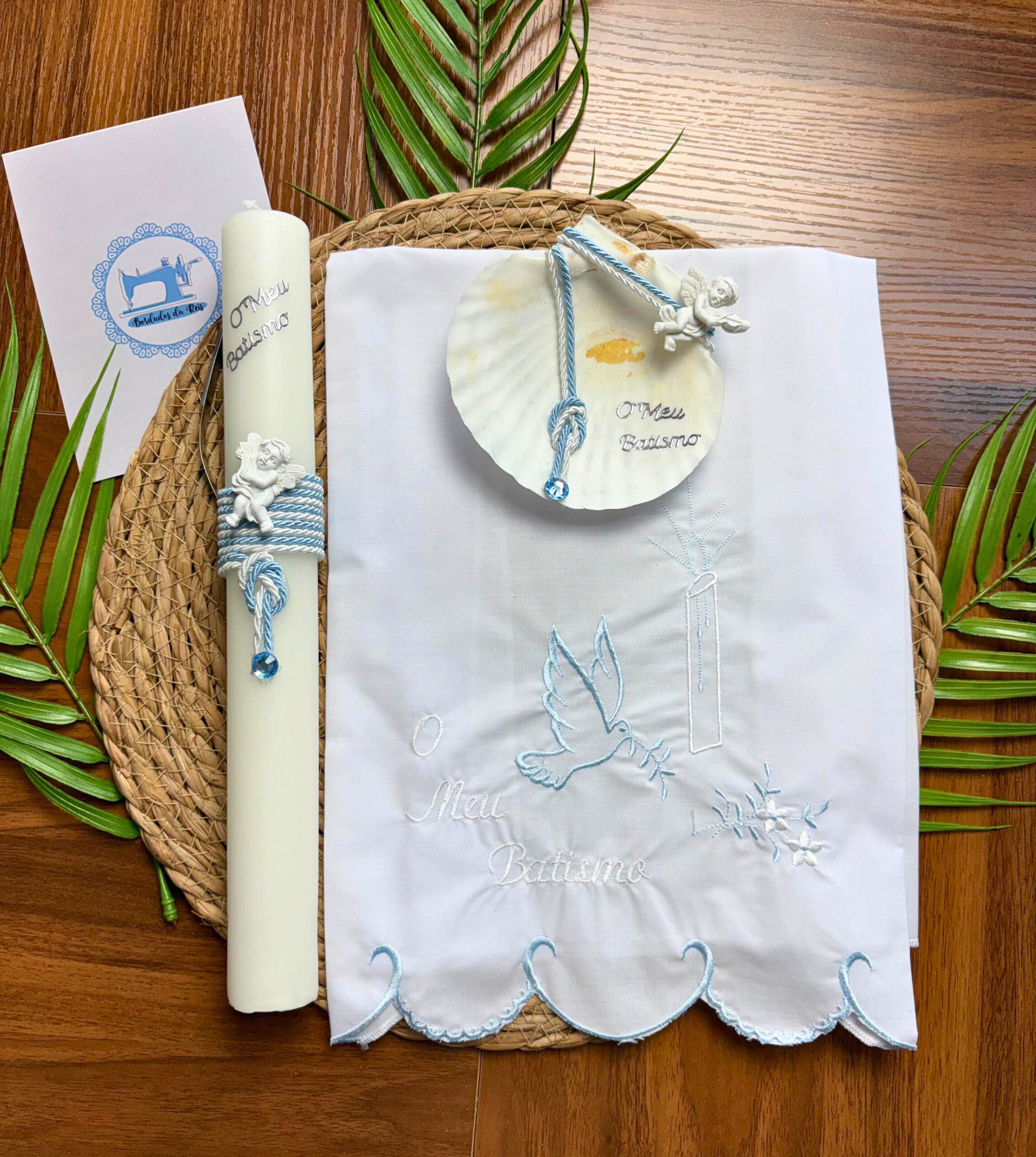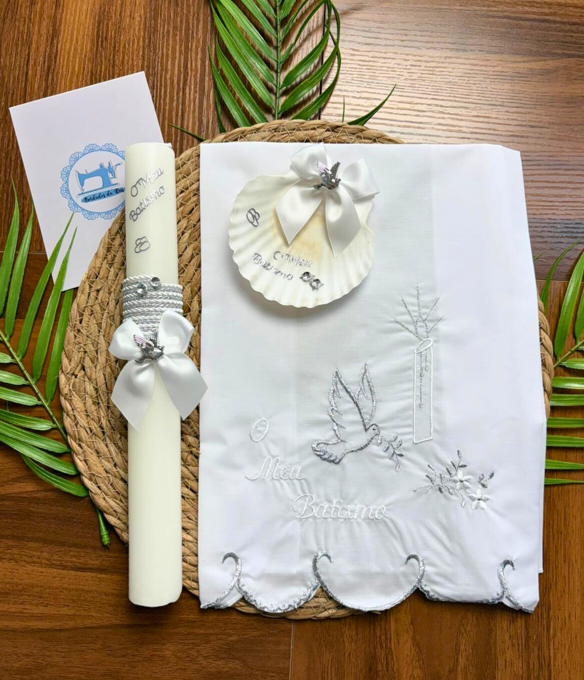 - Vela de Batismo: Um símbolo essencial, decorado com detalhes elegantes e tradicionais. Representa a luz e a proteção no caminho do bebé.