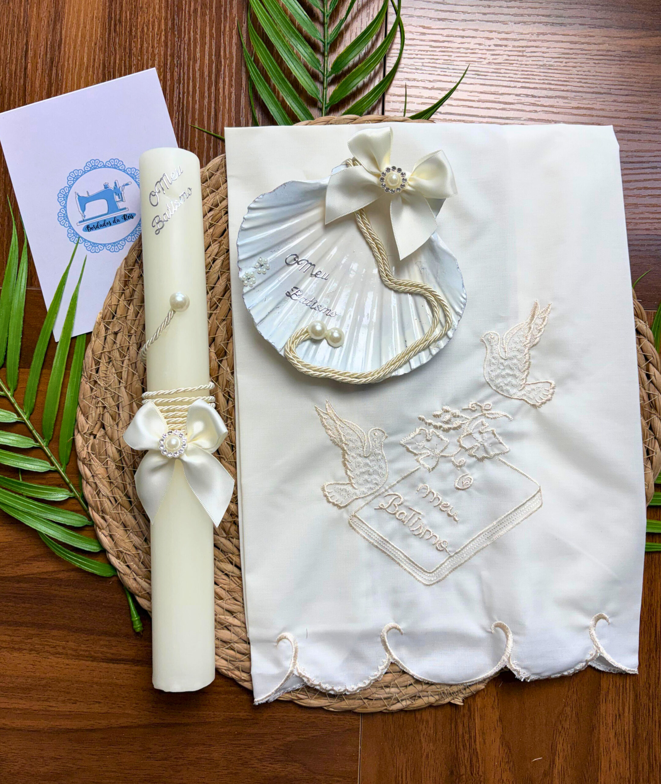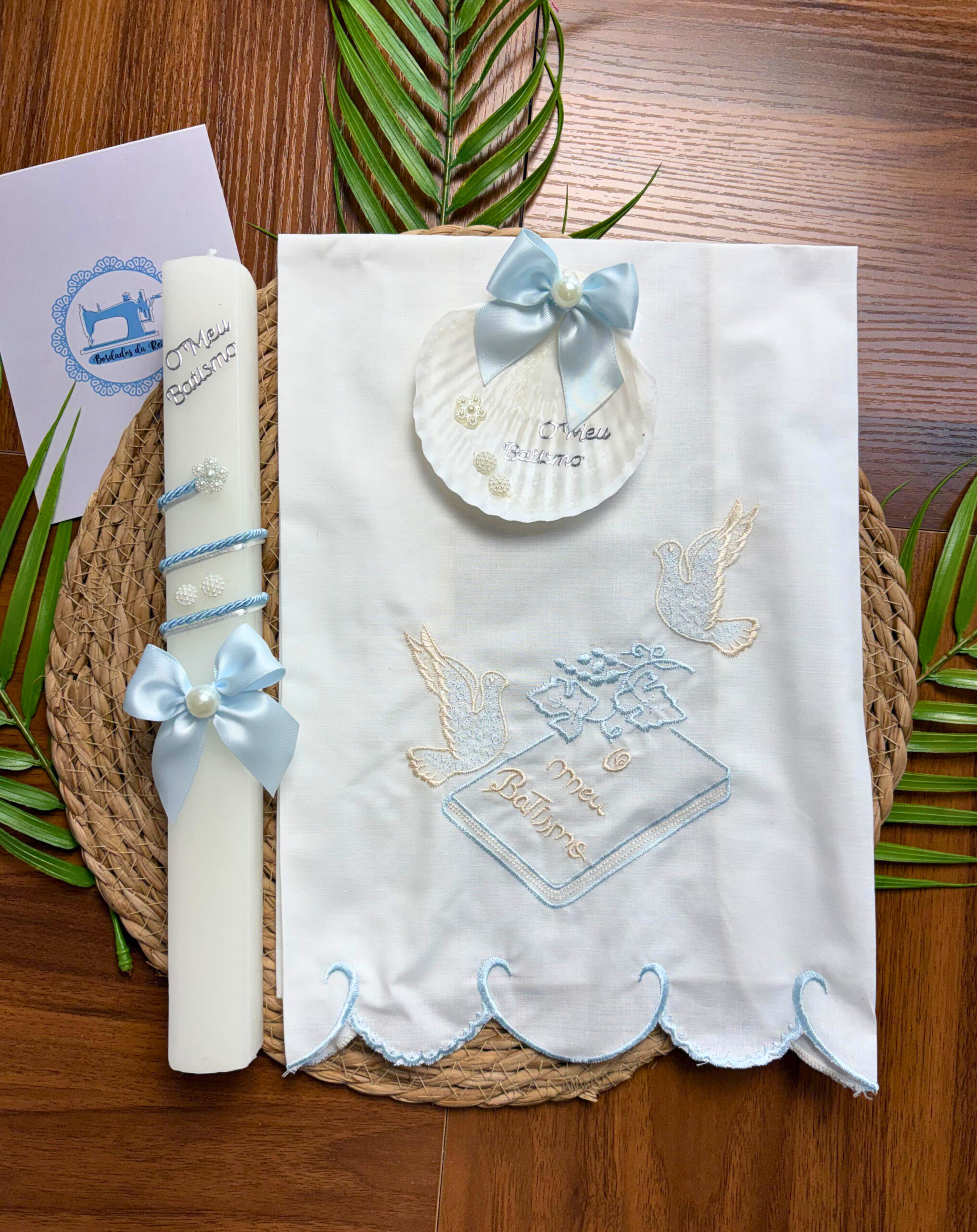 - Vela de Batismo: Um símbolo essencial, decorado com detalhes elegantes e tradicionais. Representa a luz e a proteção no caminho do bebé.