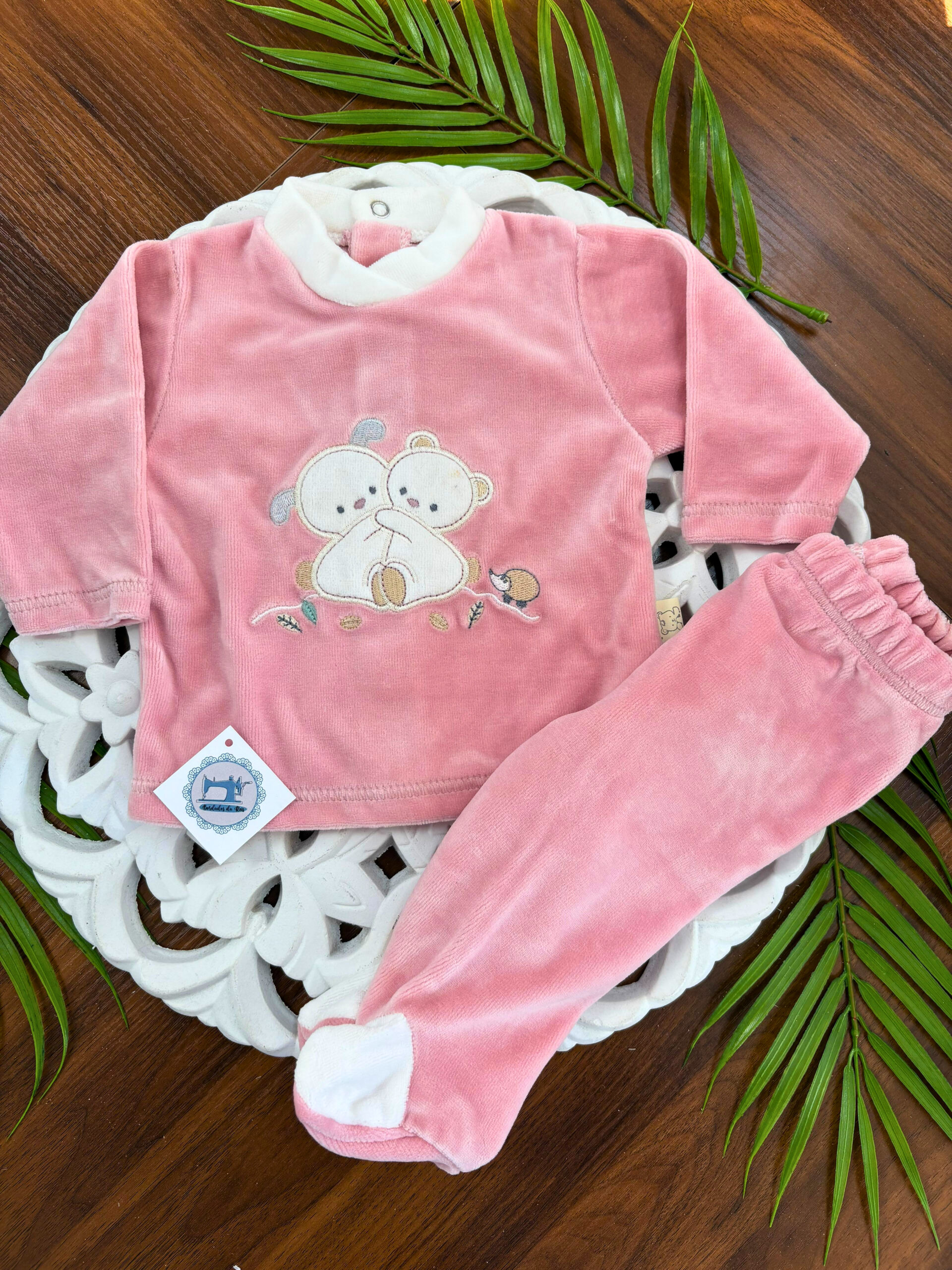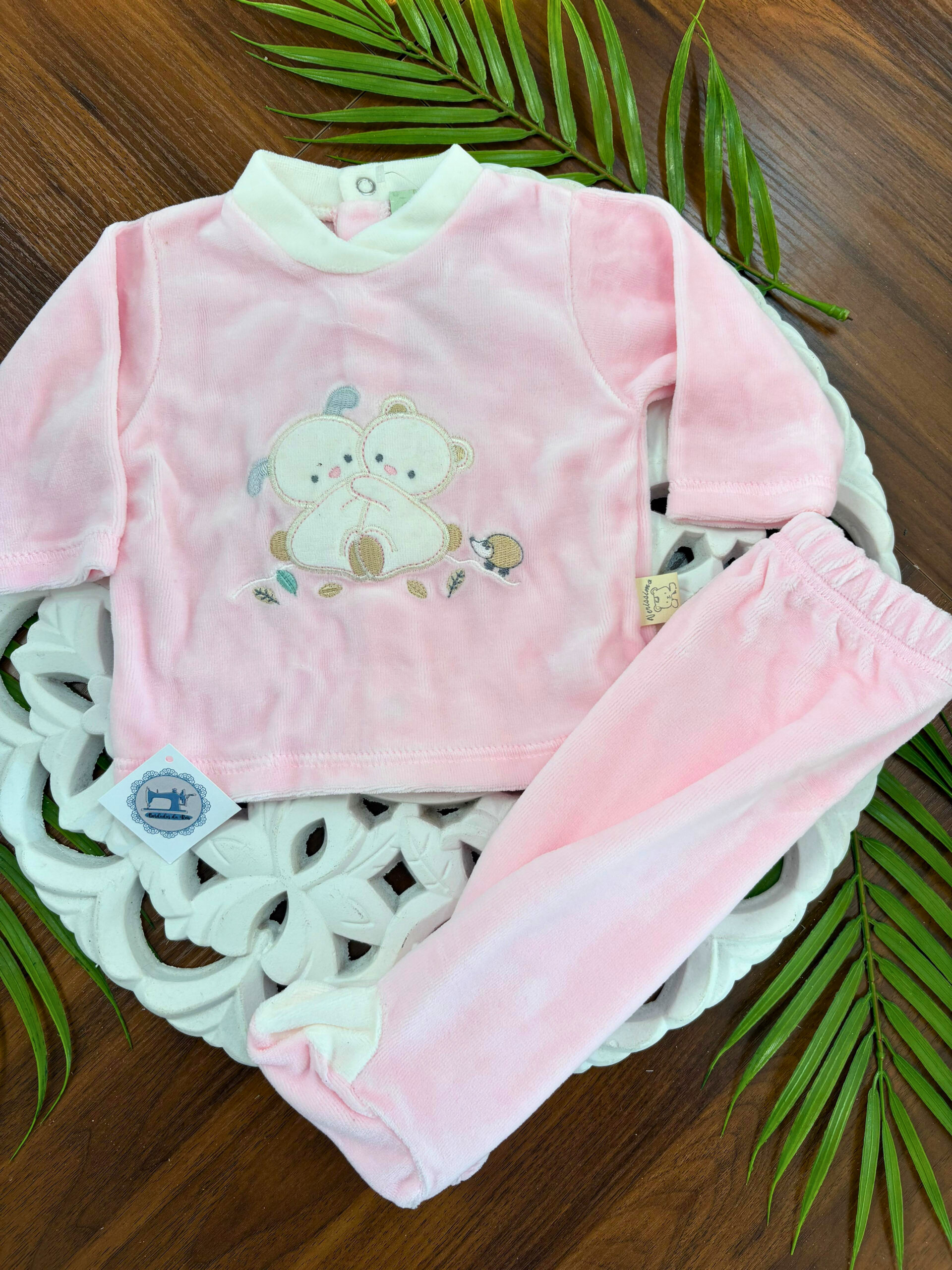 Ao mesmo tempo, o design com urso e coelho acrescenta um toque lúdico e carinhoso, tornando este pijama ainda mais especial.