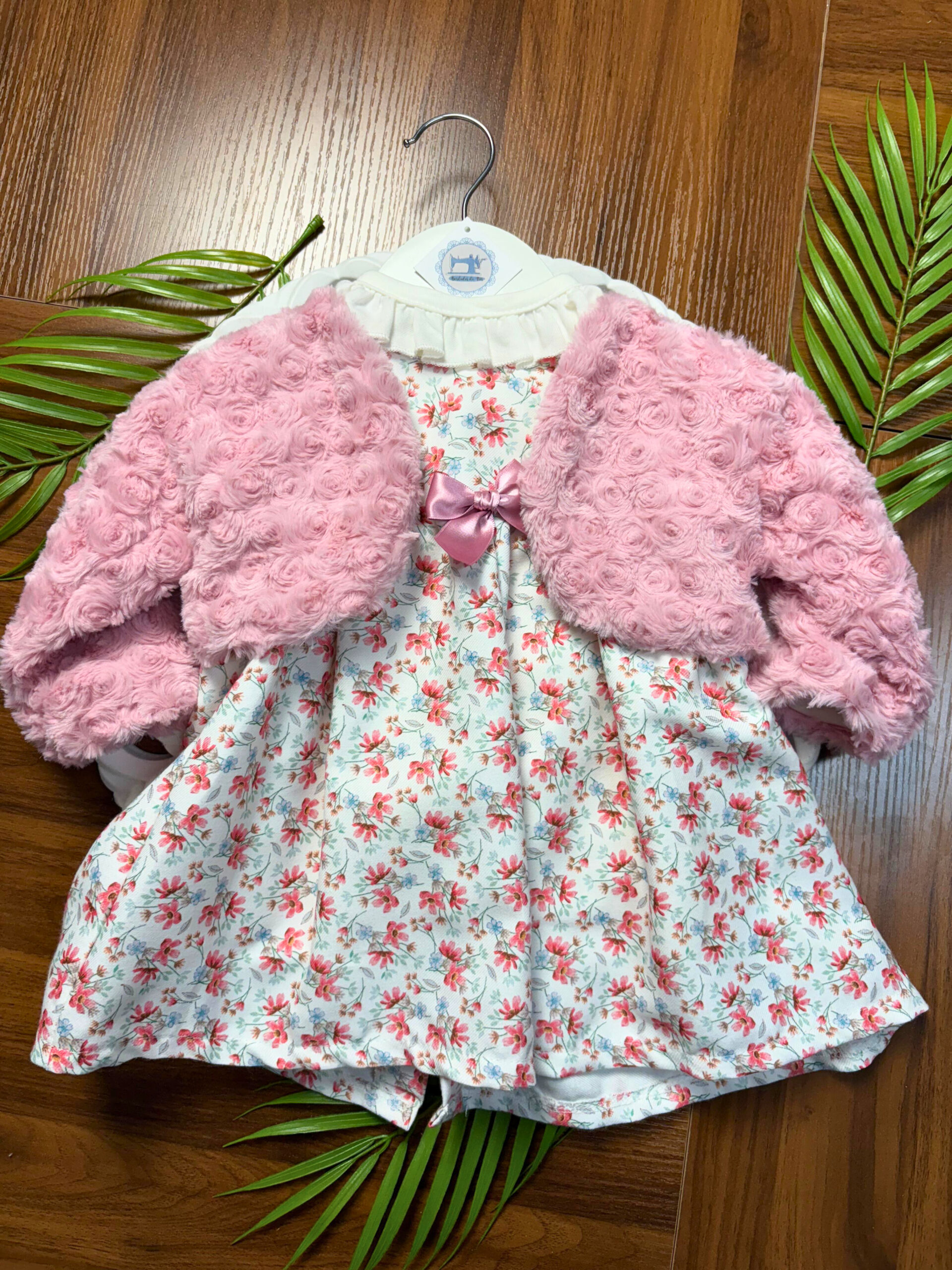Garanta já o Vestido Floral com Bolero de Pelo Rosa e proporcione à sua bebé um look delicado, quente e cheio de elegância para momentos especiais.